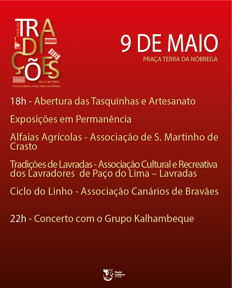 De 9 a 11 de maio, Ponte da Barca acolhe mais uma edição da Festa das Tradições, um evento que celebra as raízes culturais do concelho através da música, da gastronomia, do artesanato e dos saberes populares. Ao longo de três dias, a tradição assume o protagonismo, num programa repleto de momentos que homenageiam a identidade barquense e reforçam o elo entre gerações. A abertura está marcada para sexta-feira, dia 9, às 18h00, com a inauguração das tasquinhas e da zona de artesanato. Em simultâneo, ficam patentes três exposições em permanência: “Alfaias Agrícolas”, organizada pela Associação de S. Martinho de Crasto, “Tradições de Lavradas”, da responsabilidade da Associação dos Lavradores de Paço do Lima, e “Ciclo do Linho”, dinamizada pela Associação Canários de Bravães. A noite termina em festa com o concerto do Grupo Kalhambeque, às 22h00.