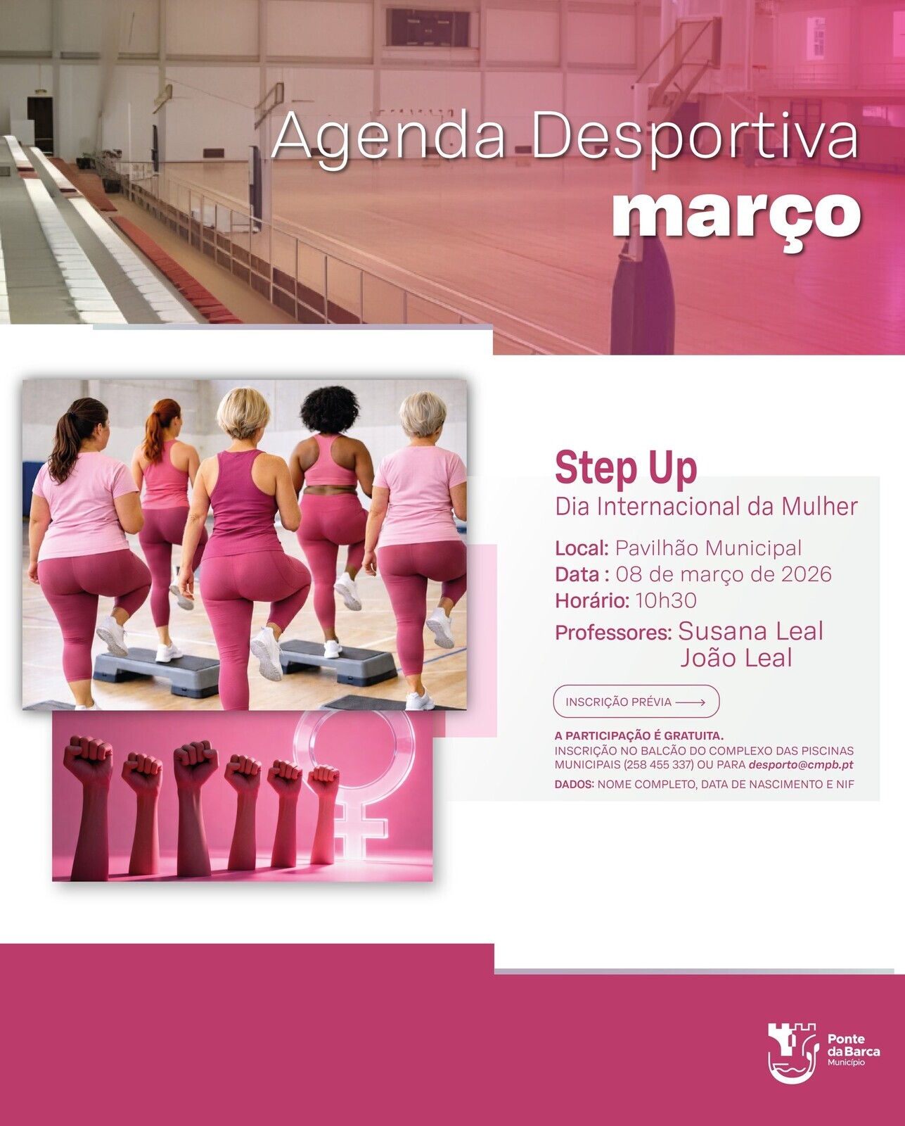 No próximo domingo, 8 de março, Dia Internacional da Mulher, o Município de Ponte da Barca promove uma aula de Step, com os professores Susana Leal e João Leal, no Pavilhão Municipal, a partir das 10h30.