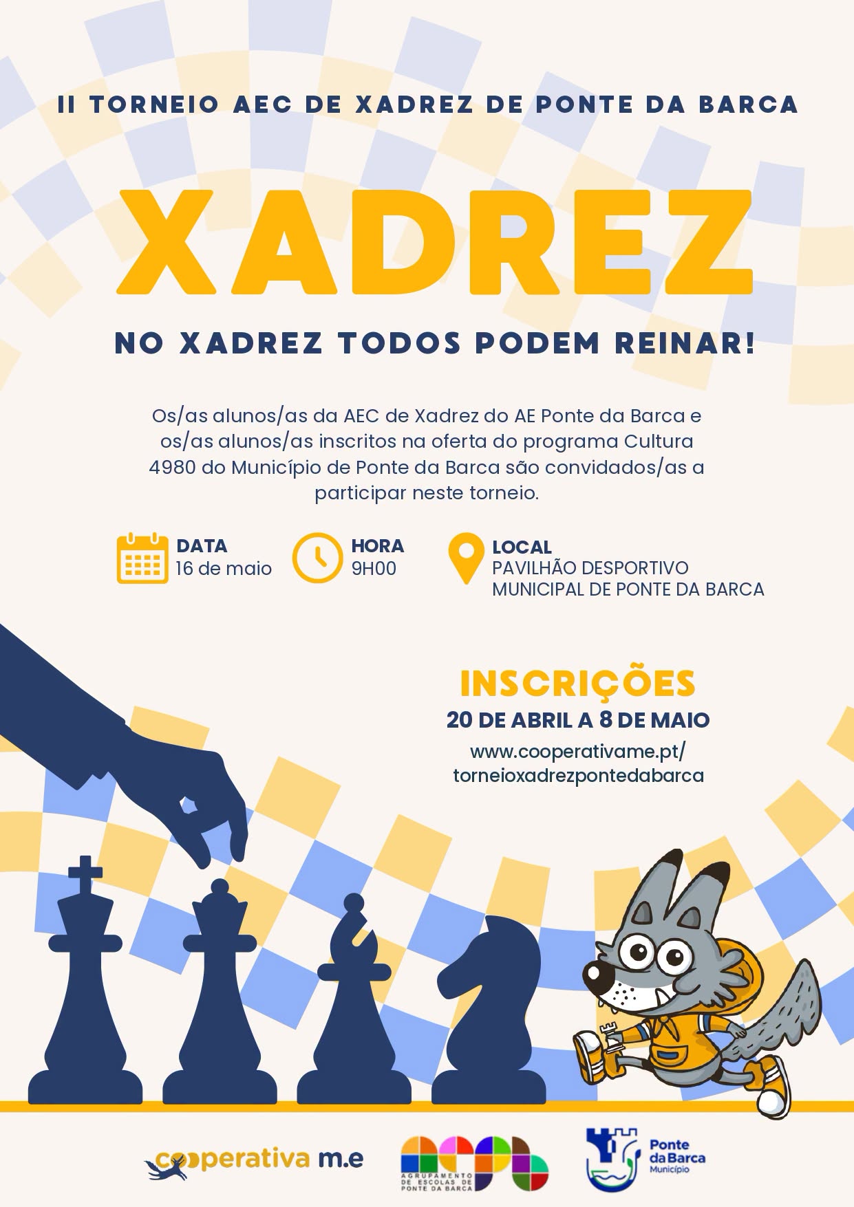 As inscrições estão abertas até 8 de maio, através do site: www.cooperativame.pt/torneioxadrezpontedabarca